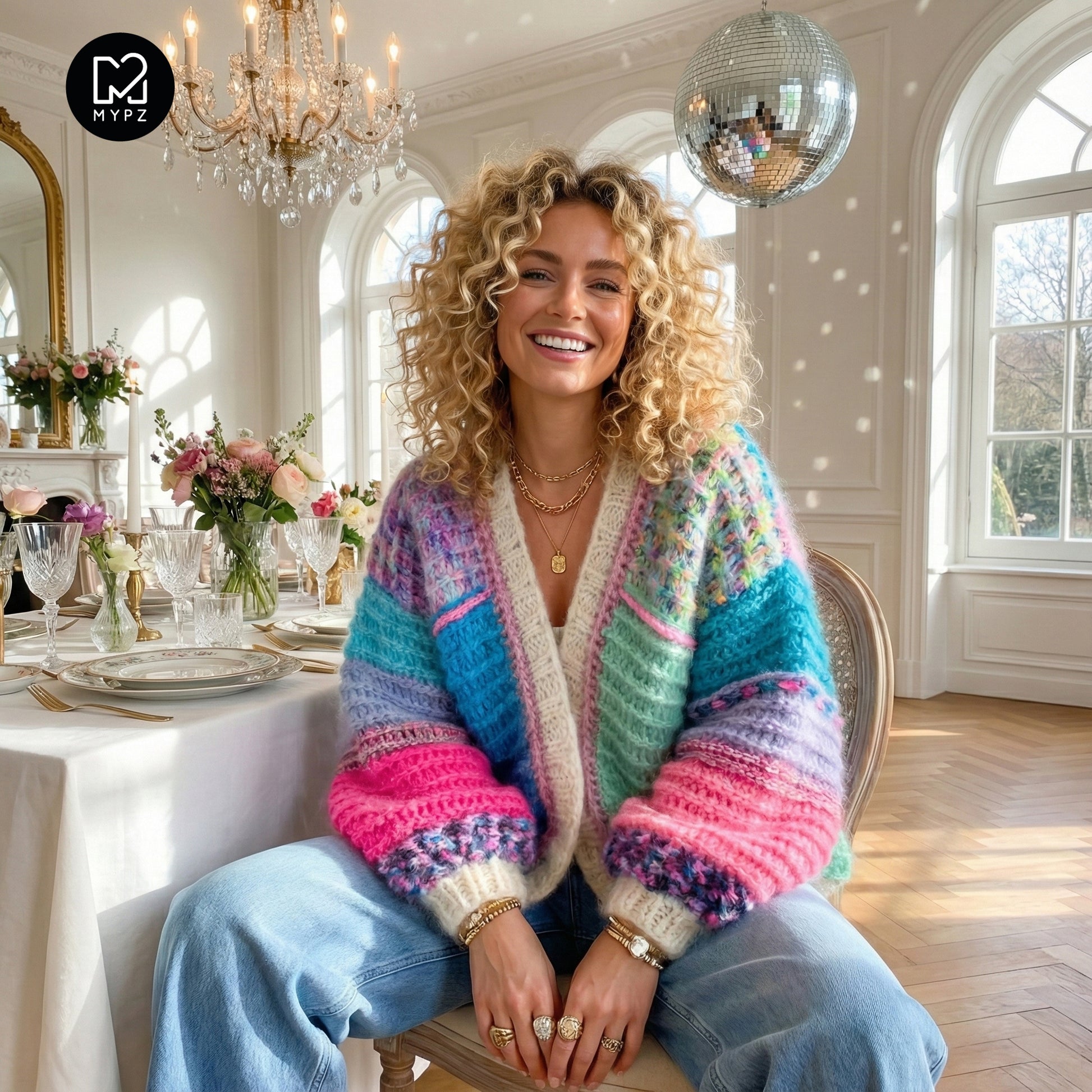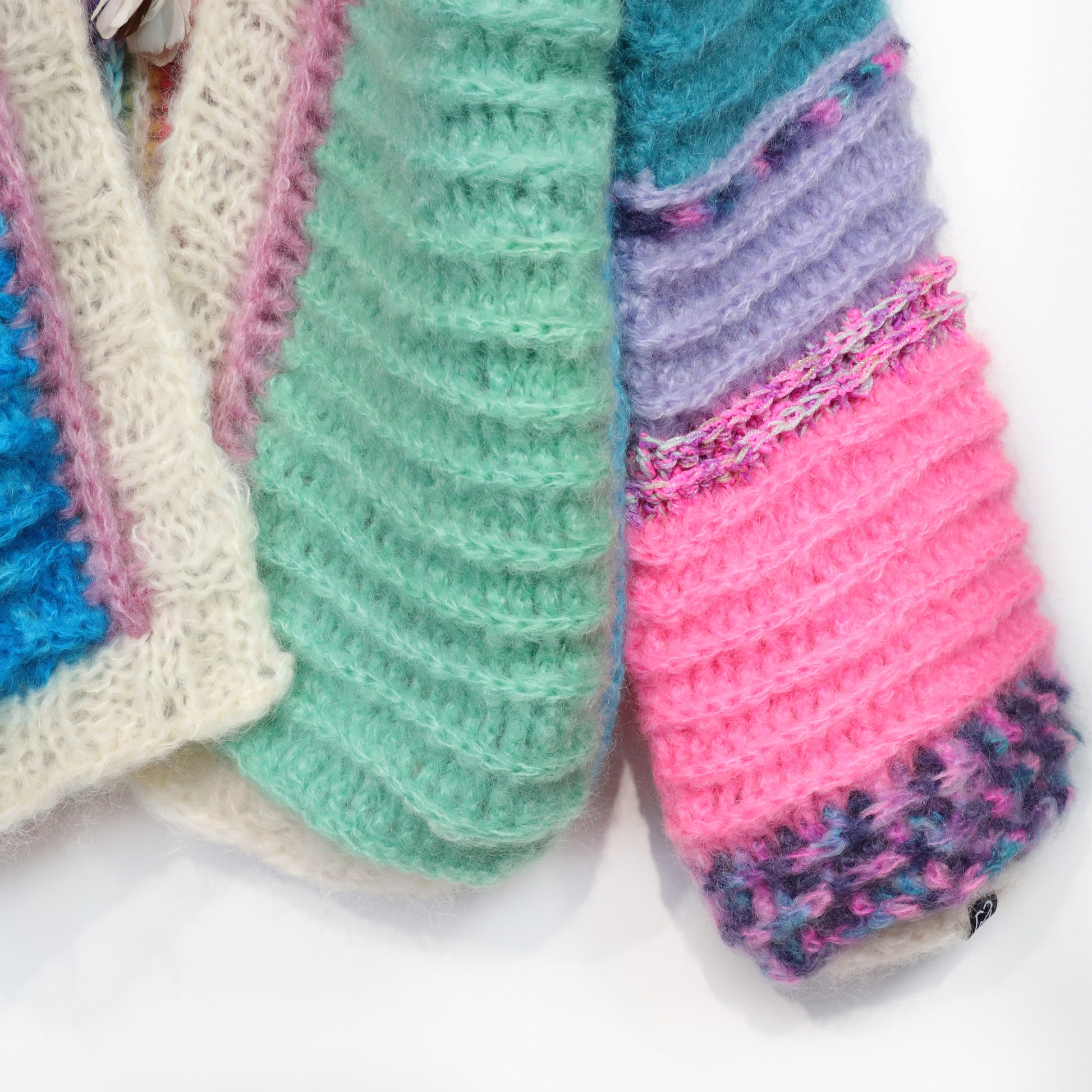 This is a handmade knit made by MYPZ in The Netherlands. Each cardigan or sweater is a unique piece and we take a lot of time and care to create these beautiful products. This beautiful sweater is made of a high quality mohair and does not pill. It is very light, warm and comfortable. These brushed yarns may shed a little but after a while, this will subside.
