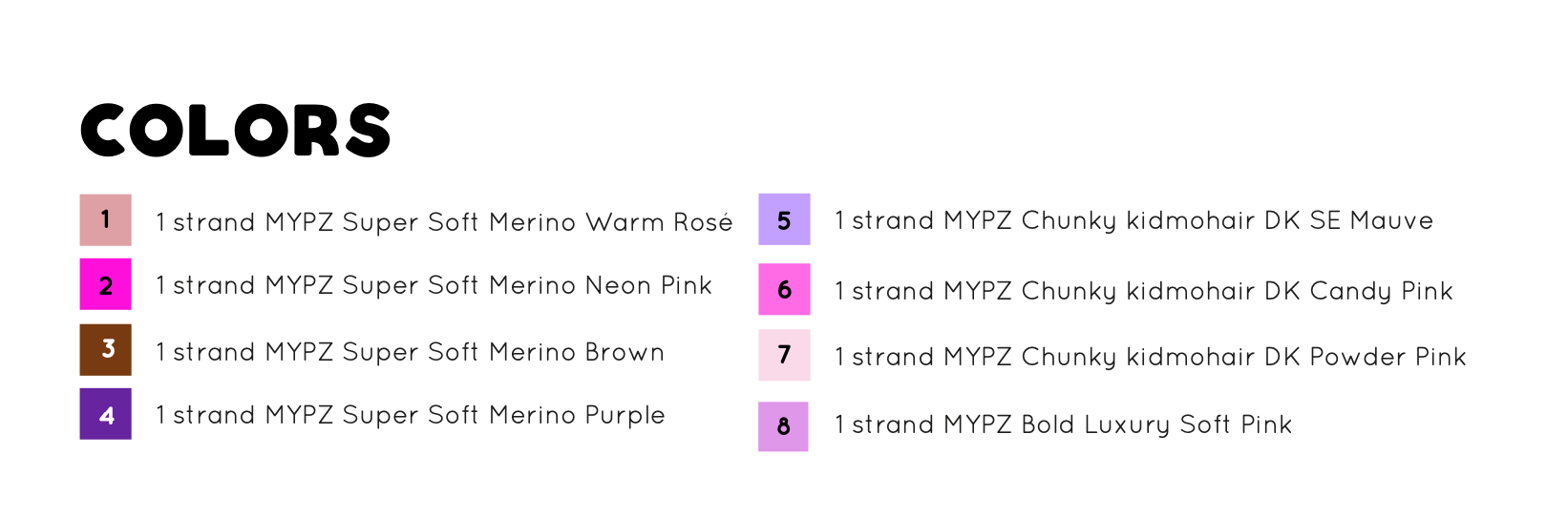 FARBE 7: • ±60 meter MYPZ Chunky kidmohair DK (78% Mohair, 13% Wool, 9% Nylon | 50g - 90m) oder ein anderes DK - garn (+5m M/L) (+10m L/XL) (+15m XL/XXL)